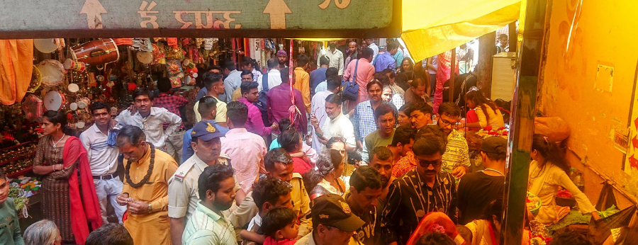 Les jours qui suivirent, la ville continua de s’emplir. Une foule s’ajoutait à la foule. Le pic de fréquentation était attendu pour la nouvelle lune. Un matin que je descendais les escaliers étroits pour atteindre la rue principale de l’île, je me retrouvais bloqué : la voie était complètement obturée par la présence d’un public compact faisant la queue jusqu’ici pour se rendre au temple. Je tentais une percée à travers les corps. Je remarquais quelques pèlerins pieds nus, bâton de marche à la main et tapis de sol sur le dos. Ils étaient salués avec respect par le reste de la mêlée. Je discutais aussi avec de nombreux fermiers : ces hommes et ces femmes de basses-castes m’expliquaient qu’ils venaient toujours en nombre à cette période de l’année, prier la rivière pour la bonne récolte de leurs céréales et le succès de leur vente sur le marché.
